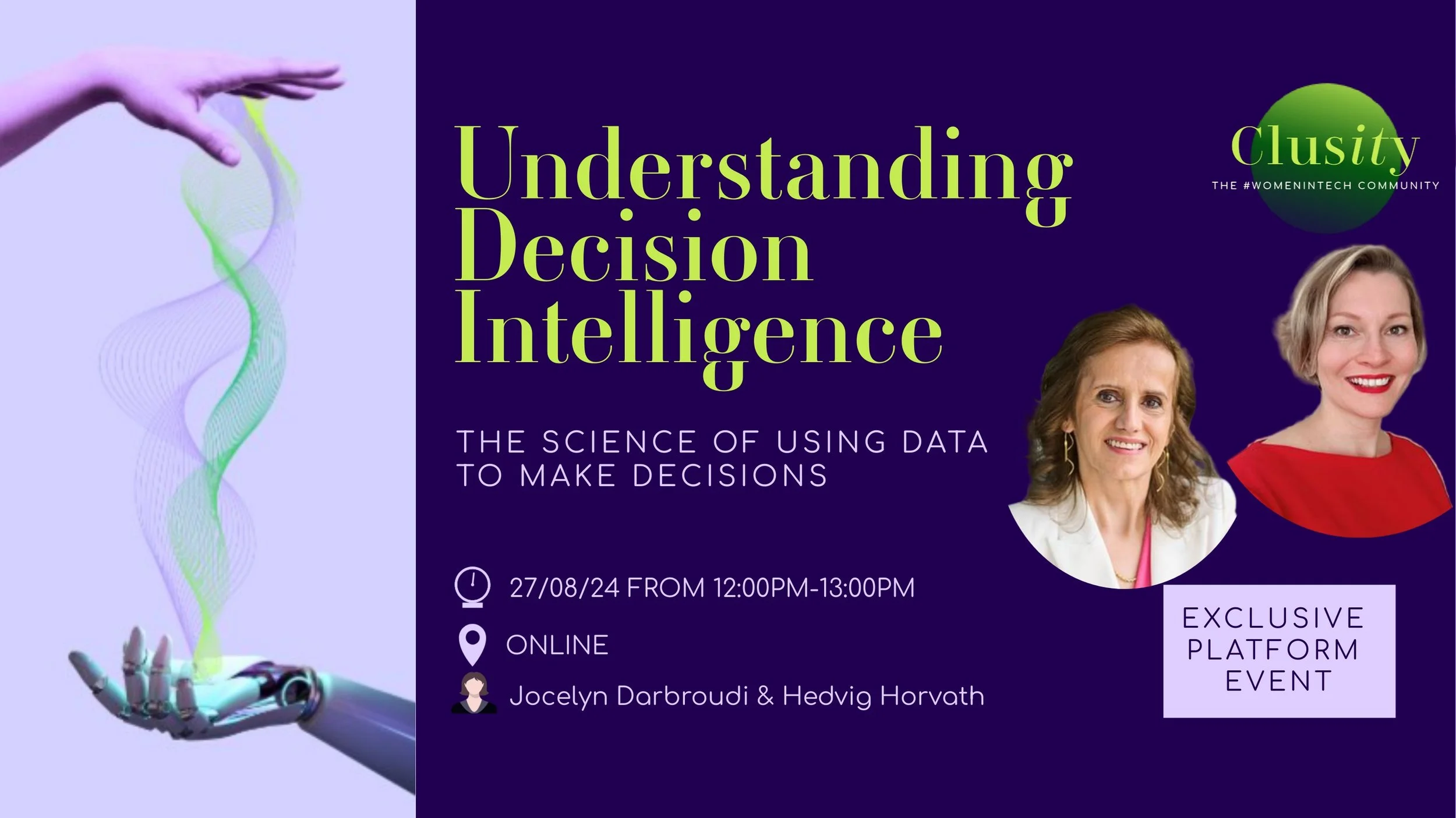 Join us for an exclusive platform event where Jocelyn Darbroudi and Hedvig Horvath will guide you through the intricate world of decision intelligence. This session will explore how to effectively use data to make informed decisions, balancing technological advancements with ethical considerations.