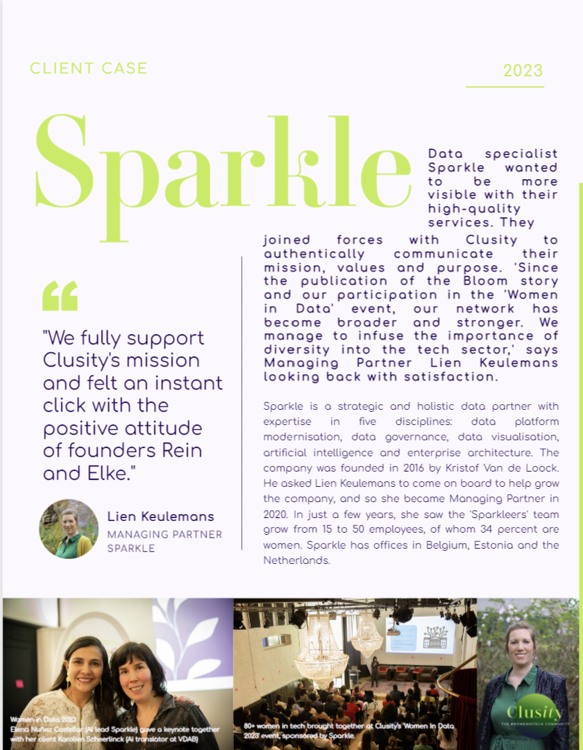 Data specialist Sparkle wanted to be more visible with their high-quality services. They joined forces with Clusity to authentically communicate their mission, values and purpose. 'Since the publication of the Bloom story and our participation in the 'Women in Data' event, our network has become broader and stronger. We manage to infuse the importance of diversity into the tech sector,' says Managing Partner Lien Keulemans looking back with satisfaction.